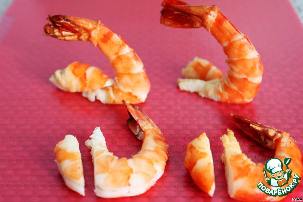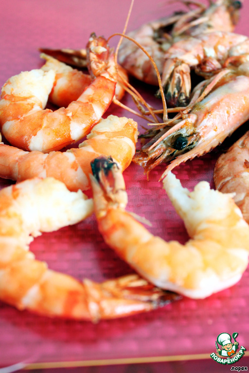 Очистить от панциря, оставляя хвосты. Сбрызнуть соком лимона. Можно слегка подсолить, но совсем чуть-чуть.