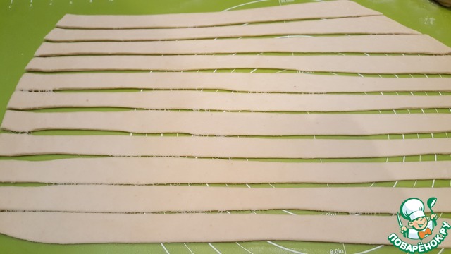Раскатываем часть теста и нарезаем ножом для пицы полосками. Поскольку мясные шарики небольшого размера, полоски тоже будут не широкими. Примерно около 1 см шириной. Так поступаем со всем тестом.