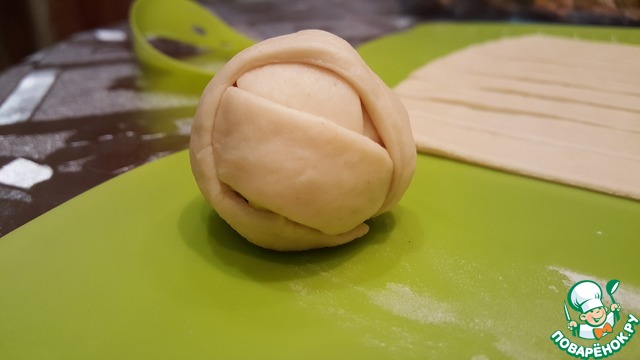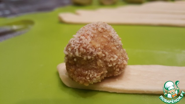 Кладём мясной шарик на начало полоски и наматываем тесто на шарик, как клубок шерсти.