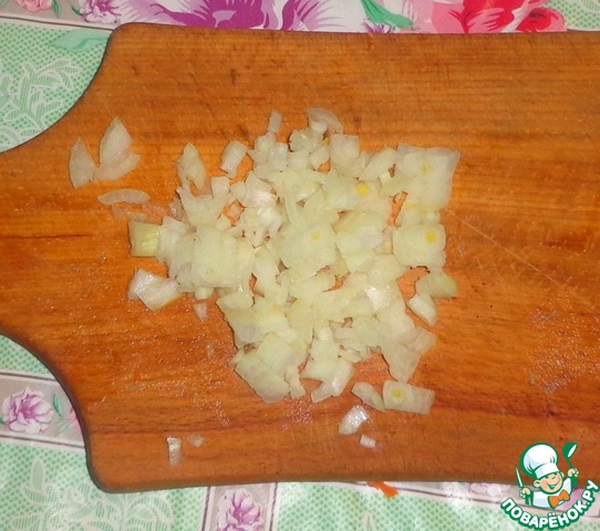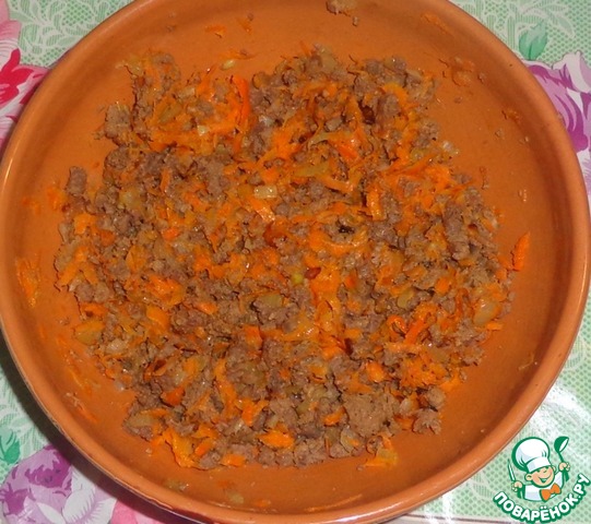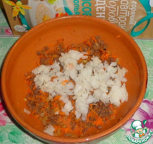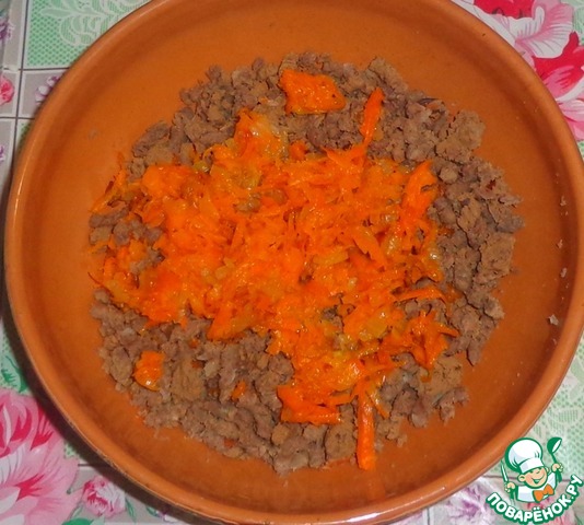 Лук с морковью обжарить на растительном масле около 5 минут и добавить в начинку. Перемешиваем.