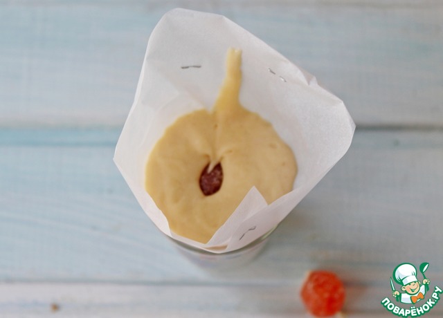 Наливаем тесто в подготовленные кулечки на 2/3 части и опускаем в них по 2 кумквата (вяленого).