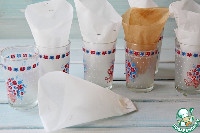 Выложить кулечки в стаканы, чтобы они были выше стаканов.