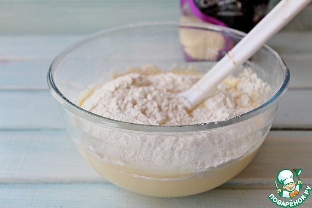 Добавить растопленное сл масло, сметану, ванилин и все снова взбить. Добавить просеянную муку и разрыхлитель и перемешать до однородности.