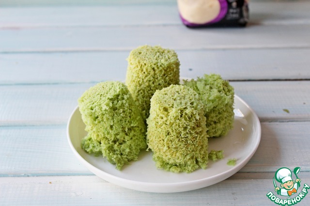 Для приготовления спонжа взбить миксером яйца, мед, сахар и краситель (зеленый), добавить муку и разрыхлитель и перемешать. Выложить массу в бумажные стаканчики на 1/4 часть, они очень сильно поползут, и выпекать в СВЧ при 600-800 гр от 1, 5 до 2-х мин. Затем их надо остудить прямо в стаканчиках.