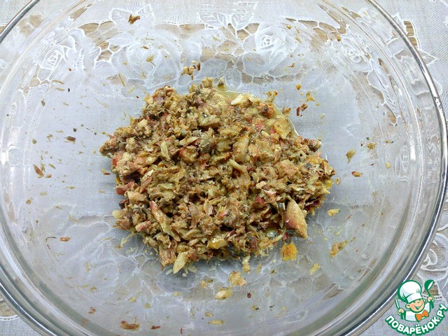 Консервированную рыбу размять, удалить крупные кости. Можно использовать любую рыбу и сырую в том числе, только надо предварительно ее отварить с добавлением лимонного сока.