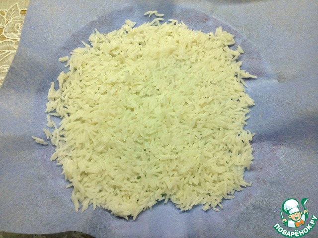 Рис отварить, выложить на бумажное полотенце, чтобы хорошо рис просушить.