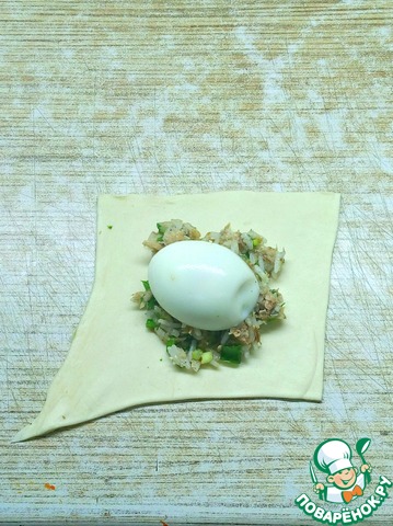 На один квадратик выкладываем ложку начинки и половинку отварного яйца.