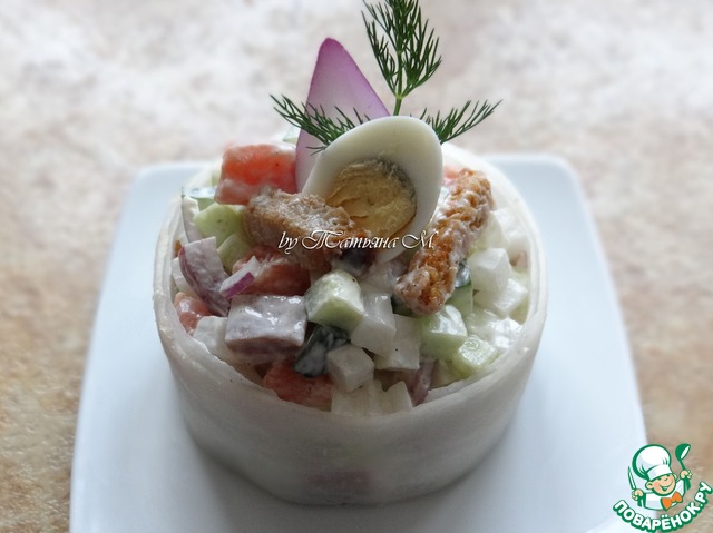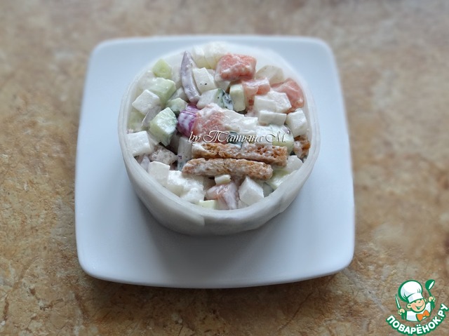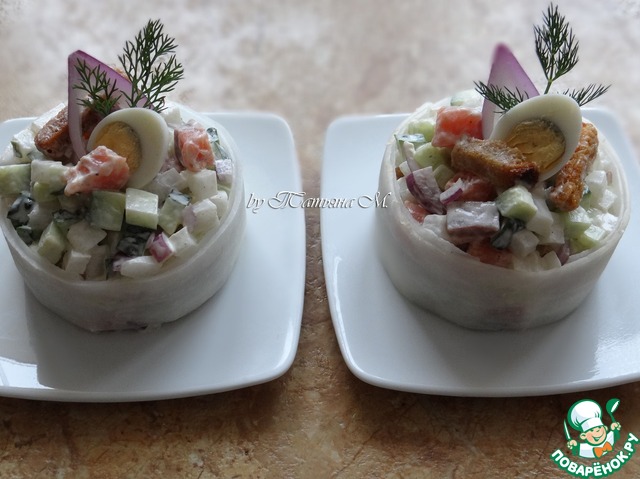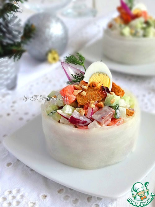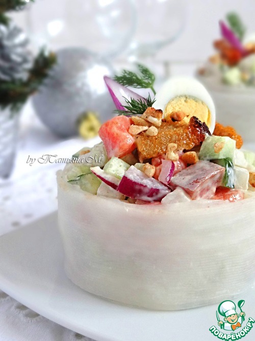 | Вкусный праздничный салат-закуска из свежих овощей с копченой семгой и ржаными сухариками! Благодаря порционному оформлению в "белой шубке", салат смотрится как нельзя кстати на новогоднем зимнем столе! |