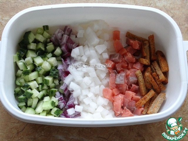 Порезать кубиками огурец, дайкон, лук, семгу, добавить сухарики;