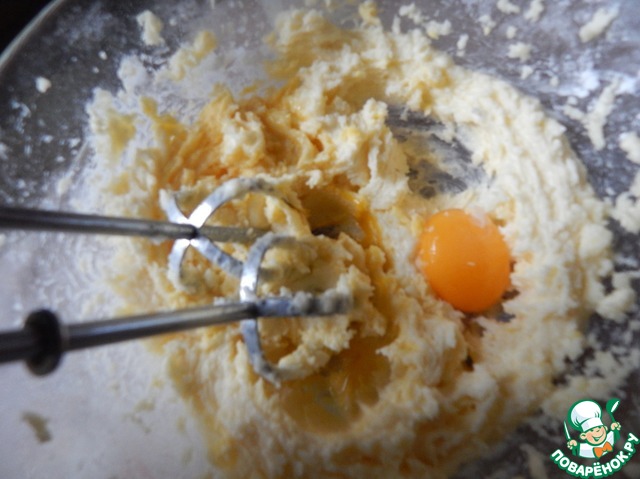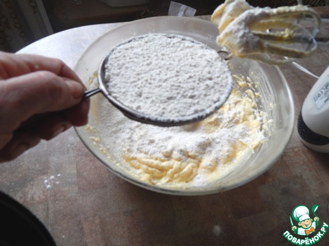 Соединяем смесь с просеянной мукой и разрыхлителем, добавить щепотку соли