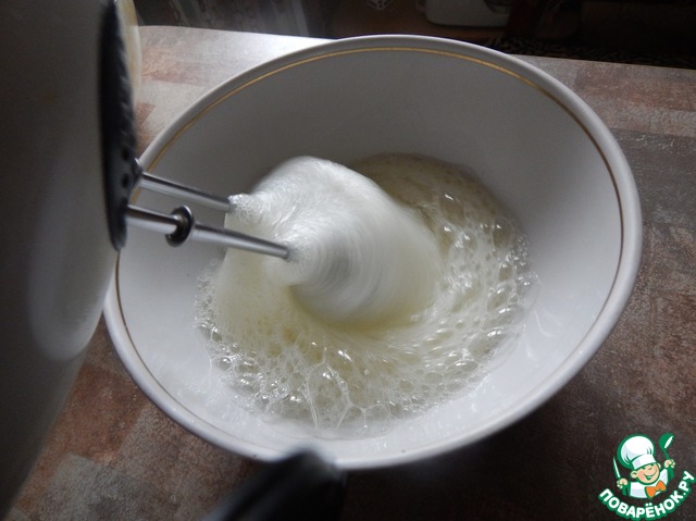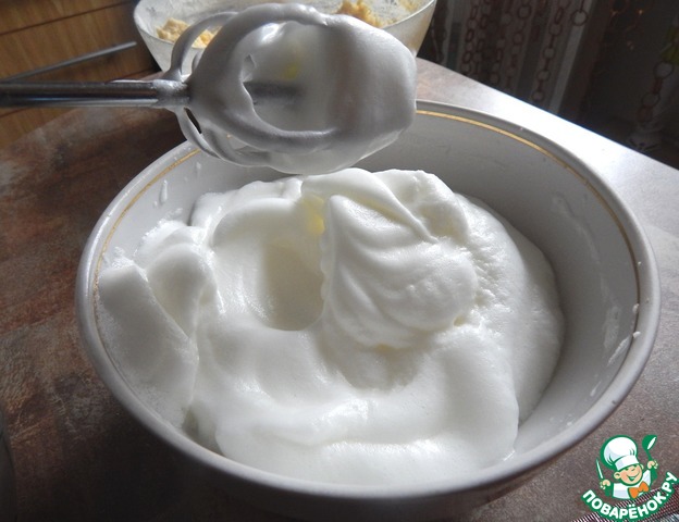 Отделить желтки от белков и вводим в смесь по одному желтку, постоянно перемешивая
