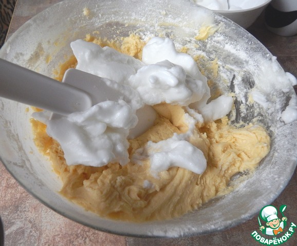 Начинаем вводить постепенно белки в тесто, аккуратно перемешивая лопаткой-после введения белков тесто станет очень нежным