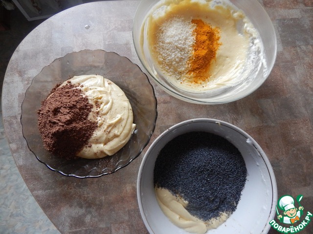 Разделить тесто на три части и в каждую добавить наполнители-в одну часть-мак, в другую-какао, а в третью-кокосовую стружку и куркуму (для цвета)