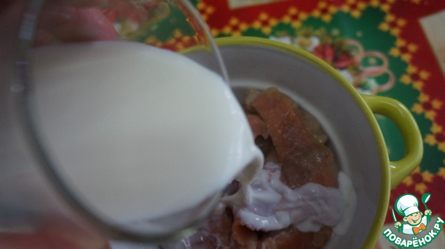 Готовлю смесь сметаны (я брала 20%) с желтком и проливаю ею рыбку.