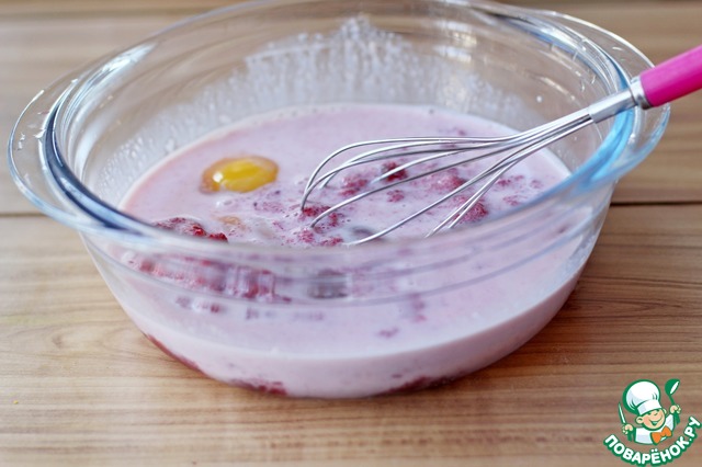 Добавить просеянную муку с разрыхлителем и перемешать до однородности. Тесто чуть гуще чем на блины.