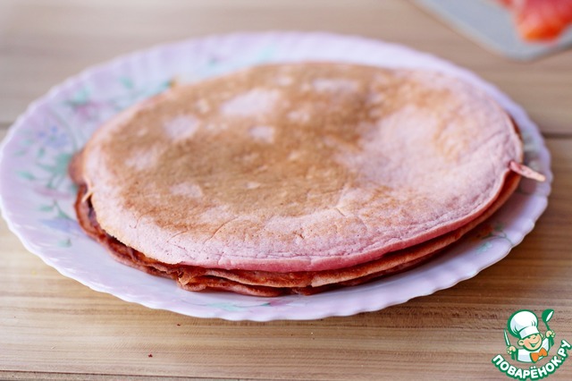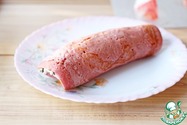 Каждый свекольный блин смазываем творожно- чечевичной массой.