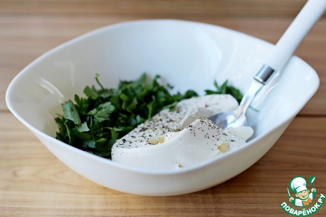 Для начинки смешать творожной сыр, я использовала Филадельфию, со сметаной и мелко нарезанной зеленью петрушки. Приправить по вкусу.