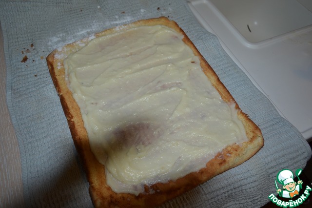 Готовому коржу дайте немного остыть. Переложите на полотенце, присыпанное сахарной пудрой. Аккуратно сверните в рулет, дайте полежать в таком состоянии минут 5, чтобы корж принял форму. Далее расправьте намажьте остывшим белым кремом. Оставляя по краям примерно по 1 см пустого пространства.