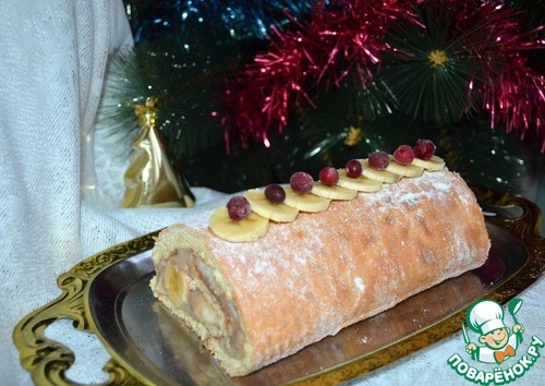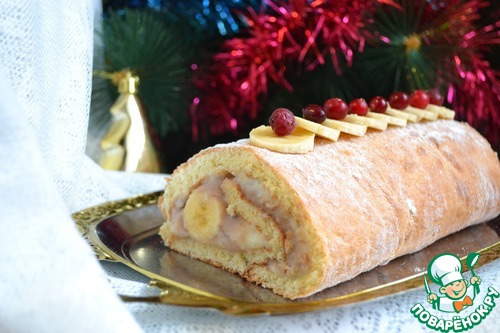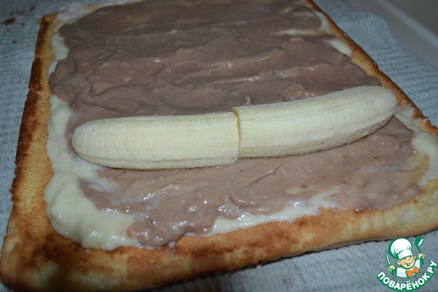 А вот и наш сюрприз для обезьянки :) Банан) Положите его на край рулета. Аккуратно сверните все в рулет. Украсьте по желанию)