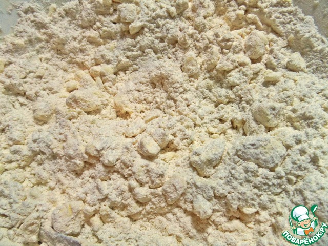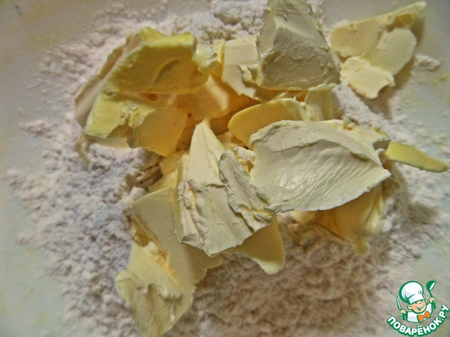 Готовить будем рубленое тесто, оно похоже на слоёное и с ним я пеку также сладкие варианты! Маргарин отрезаем кусочками в просеянную муку. Всыпайте не всю муку, так как мука разная!