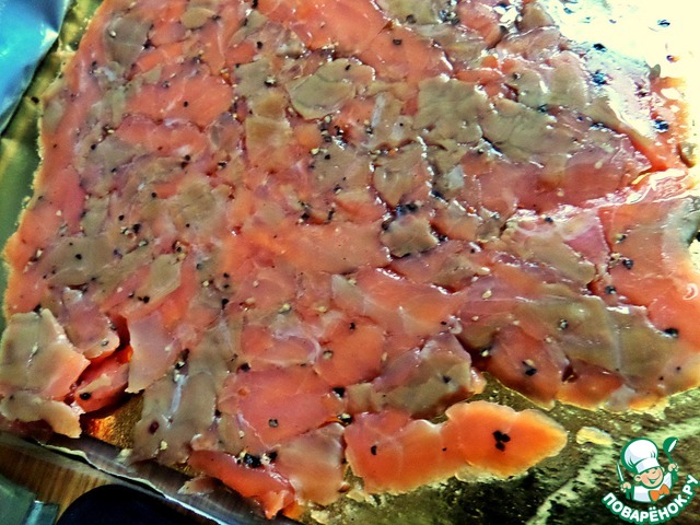 Нужна упаковка копчёного лосося (у меня с солью и лимонным перцем). Он уже маленькими кусочками.
