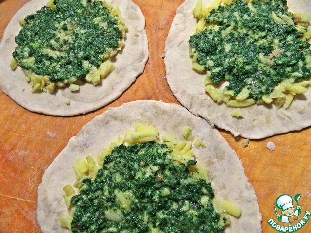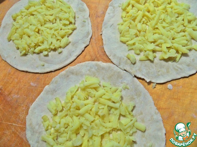 Теперь готовим шанежки. Отрезаем от теста по кусочку. Раскатываем круги размером с блюдце.