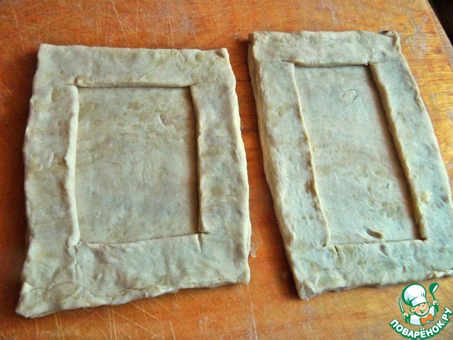 Две части послужат основой, из двух вырезаем оконца. Приклеиваем их взбитым яйцом к основе.