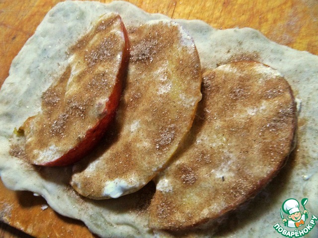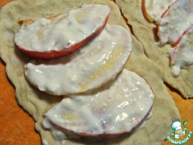 А теперь, как обещала, из остатков теста будем делать яблочные слоечки. Раскатать прямоугольники и выложить дольки яблока, смазать сметаной.