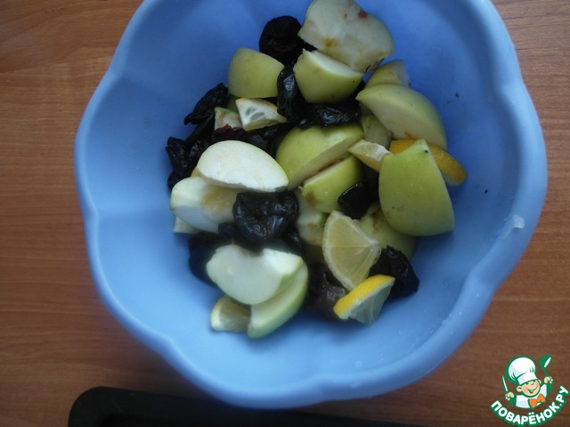 Утром занести гусика, и чуток в пакет сбрызнуть лимонный сок. Тем временем приготовить начинку. Очистите и порежьте крупными дольками яблоки. Смешайте с целым черносливом. можно добавить пластинки лимона вернее их четвертую часть. Все хорошо перемешать. Заполнить гуся начинкой, закрепить зубочистками, пакет завязать.