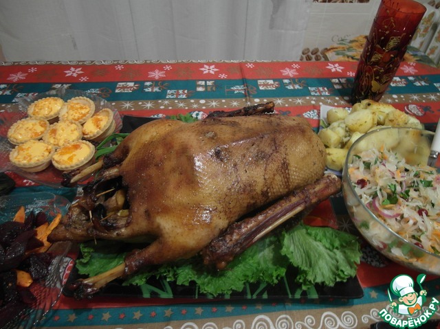 | Каждый год на новый год или на Рождество запекаю гуся. Испробовали много вариаций. Но гусик по этому рецепту меня просто влюбил в себя. Он буквально улетел с тарелочки (гусь ведь))) ). Начинка это отдельные впечатления, прекрасно сочетается с мяском! Съедается полостью. Еще отдельно конечно же на гарнир готовлю картошечку. Попробуйте - не пожалеете! Гусь мягонький с хрустящей корочкой!!! |