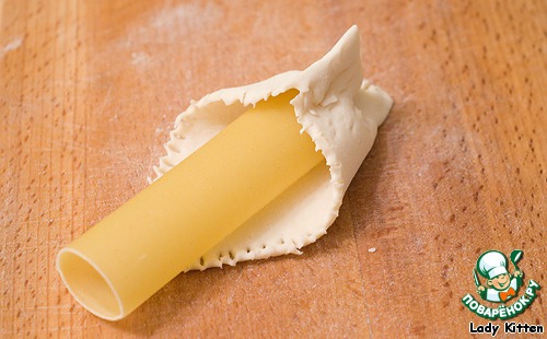 Вокруг каннеллони (большой макаронины) сформировать листик с черенком. Каннеллони придаст форму нашему листочку. Уложить листики на противень и выпекать при 200°С до золотистого цвета.