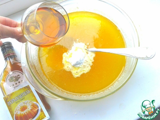Выливаем в смесь коньяк и разрыхлитель. Или как я указала в ингредиентах соду, гашенную уксусом. Тшательно перемешиваем.