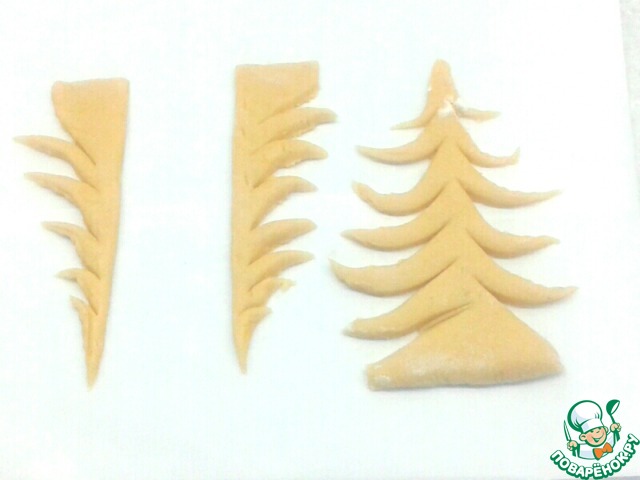 После выпечки, пока изделие горячее, примеряем ёлку к выемкам и выравниваем