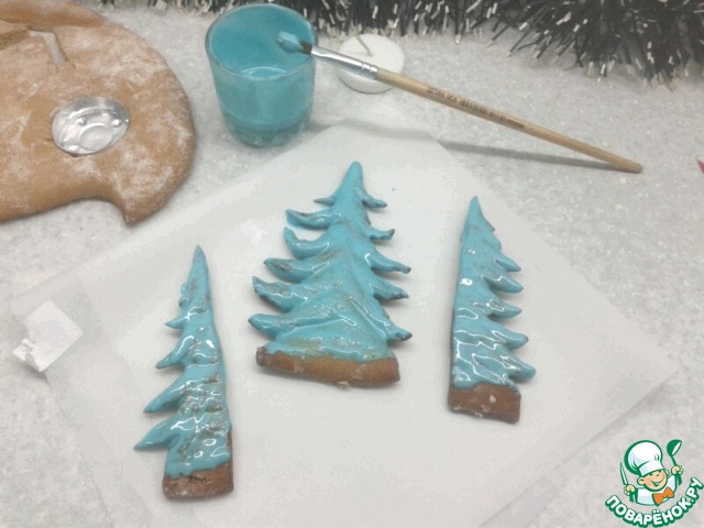 Готовую ёлочку покрываем айсингом. У меня с добавлением пищевого красителя. Даём подсохнуть. Я не стану делать МК по айсингу. И на Поварёнке и на просторах инета есть масса рецептов и прекрасных видео по его приготовлению.