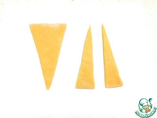 Тесто отдохнуло. С ним нужно работать на припылённой мукой поверхности. Итак! Отщипыпаем кусочек теста. Раскатываем его толщиной 3- 4мм. Вырезаем два равнобедренных треугольника. У меня высотой 10 см. Один треугольник режем пополам.