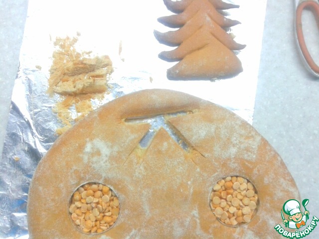 Отщипываем кусок теста. Раскатываем толщиной 6- 7 мм. Придаём форму. Любую! Вырезаем отверстия, величиной с будущий светильник ( у меня свечи- таблетки), вынимаем горящую часть. Основу вставляем в отверстия и заполняем горохом или фасолью. Готовой ёлкой отмечаем место, где она будет стоять (делаем хорошие вмятины). Выпекаем 15- 17 мин пр. t 180'.