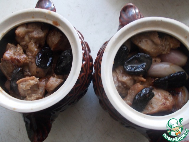 Перемешайте и разложите по горшочкам вместе с черносливом. Поставьте в духовку 175С. на часик с закрытыми крышечками!