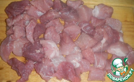 Свинину моем и режем на средние кусочки. Солим, перчим во вкусу.