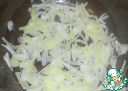 Лук нарезаем полукольцами (мне попался очень горький, резала произвольно) и обжариваем в растительном масле 3-5 минут.