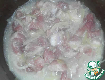К луку добавляем мясо, слегка обжариваем, наливаем немного водички и тушим.