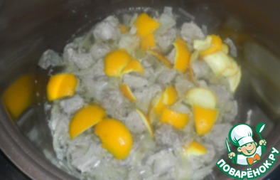 Добавляем корочки цитруса в мясо и тушим до мягкости апельсиновой кожуры.