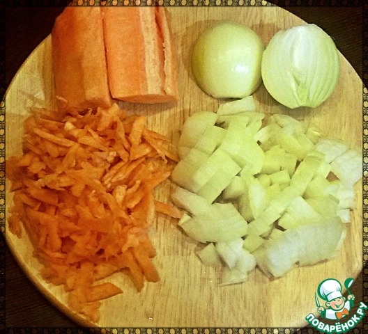 Лук порезать мелко, морковь натереть на крупной терке.
