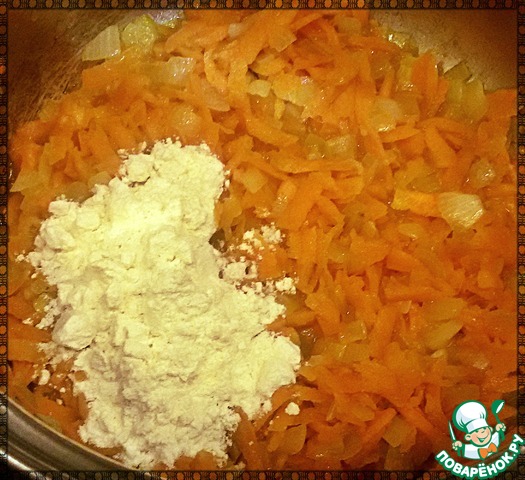 Я для приготовления гуляша использую небольшую кастрюльку объемом 1,5 л. В кастрюлю налить растительное масло и нагреть на среднем огне. Добавить лук и поджаривать до золотистого цвета. Далее добавить морковь и обжарить примерно 2-3 минуты. Так как я не особо люблю жирный гуляш, поэтому когда добавляю морковь я наливаю еще и воду (бульон), столько чтоб морковь тушилась, а не пригорала (это ~50 мл воды или бульона). Можете просто изначально налить больше растительного масла. Далее добавить муку, хорошенько перемешать (чтоб не было комочков), налить 100 мл воды (бульона) и перемешать.