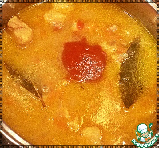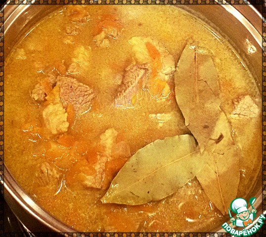 Далее добавить мясо и потушить в течении 2 минут, постоянно помешивая. Затем налить ~350-400 мл воды или бульона (чтоб слегка покрывала мясо). Довести до кипения и огонь убавить на минимум. Добавить лавровый лист, прикрыть (не полностью) крышкой и тушить 20 минут, периодически помешивая.