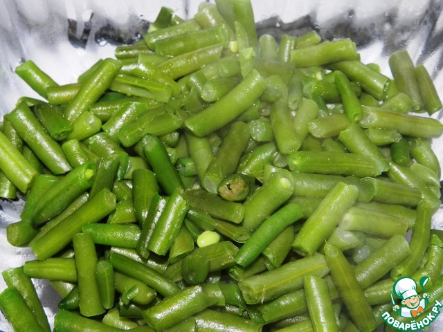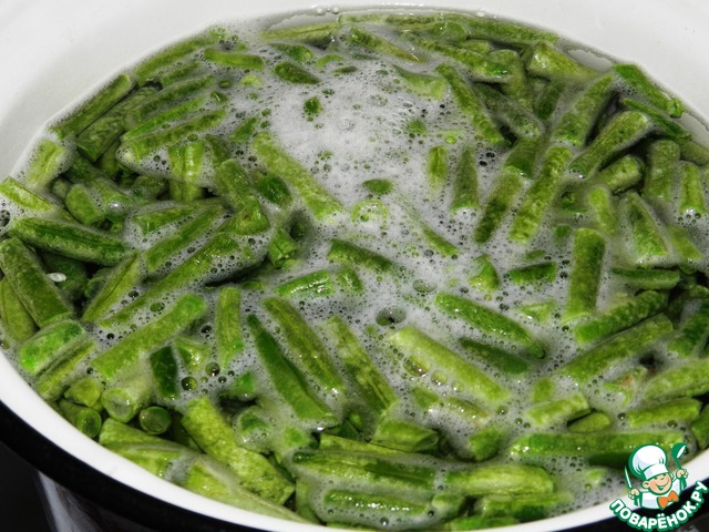 Для спаржи вскипятить воду, посолить, добавить 1 ч. л. сливочного масла. Бросить спаржу в кипящую воду и после закипания варить 5-7 минут. (В двух магазинах не оказалось спаржи, поэтому пришлось купить стручковую фасоль)
