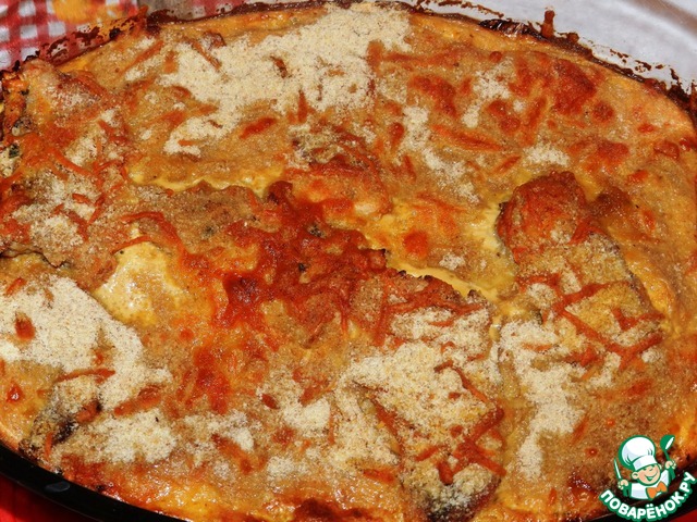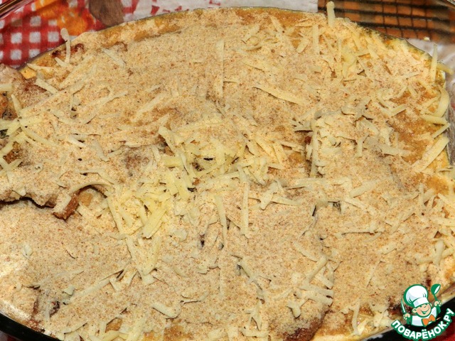 Форму для запекания смазать сливочным маслом, выложить в неё мясо, залить заливкой. Сверху посыпать тёртым сыром и панировочными сухарями. Отправить в духовку на 20 минут. (200 градусов)