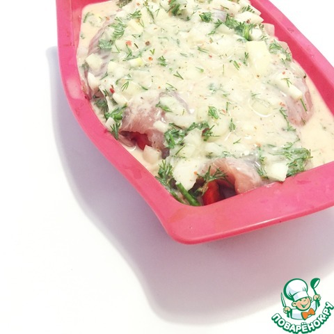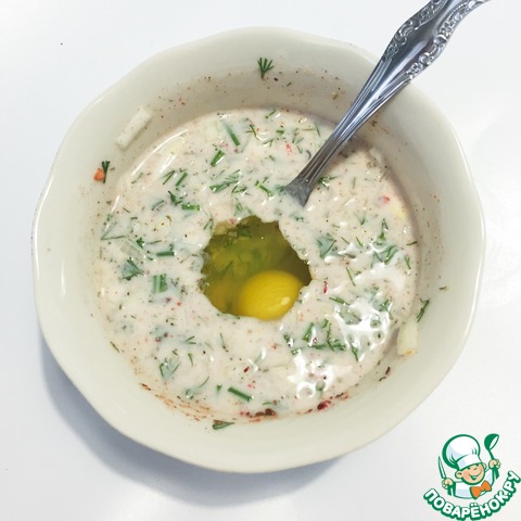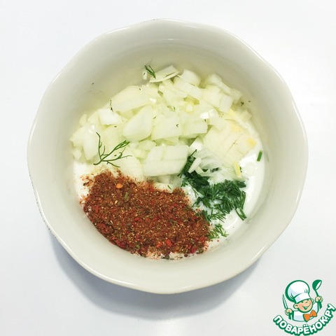 Смешать кефир с мелко порубленной зеленью, луком и специями