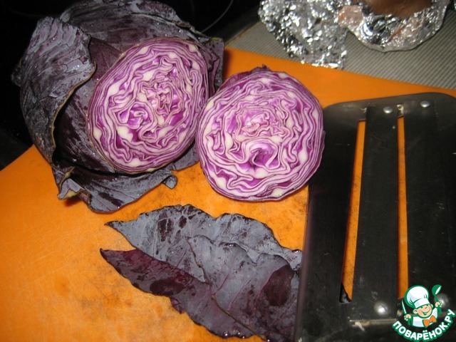 | Люблю винегреты! Так и хочется отступить от проверенных ходов! Здесь почти все красное: капуста, свекла, фасоль, и если морковь и картофель в итоге окрасятся - ничего страшного! Будет очень красиво и необычно на вкус: ведь капуста будет свежей, морковь - корейской, а картошка и свекла будут особенно вкусными, потому что мы их запечем. Ух, ты, давайте пробовать! ;-) |