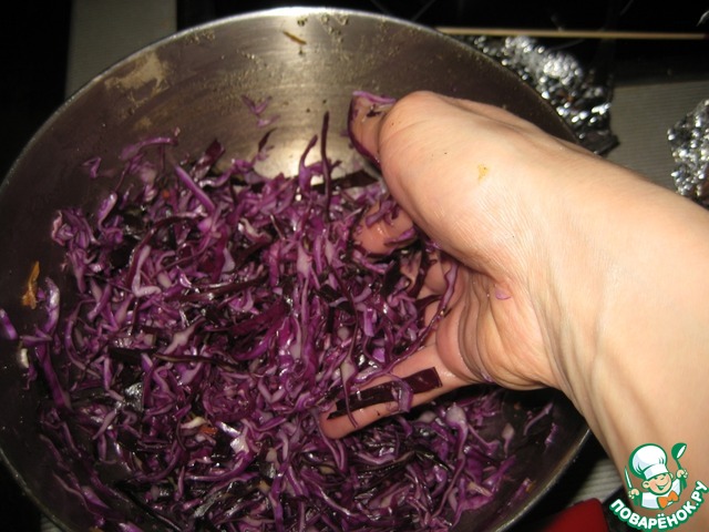 Добавив 1-2 щепотки соли, помнем капусту, чтобы немного пошел сок. После чего отправим и её в холодильник отдыхать