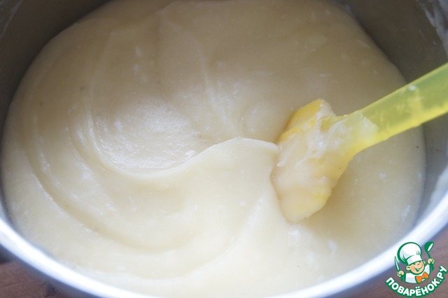 Начать стоит с приготовления картофельного пюре. Картофель моем, чистим, снова промываем. Заливаем водой, подсаливаем и варим до готовности. Готовый картофель пробиваем блендером, добавляем сливочное масло и яйца. Все быстро перемешиваем. Получается густая кремообразная масса. В процессе остывания она станет гуще.